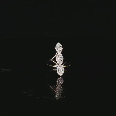 This yellow gold ring features three marquise-cut lab-grown diamonds aligned vertically, each encircled by a halo of brilliant stones. The sculptural open band adds a modern twist, making it a true statement piece inspired by celestial elegance and floral symmetry.