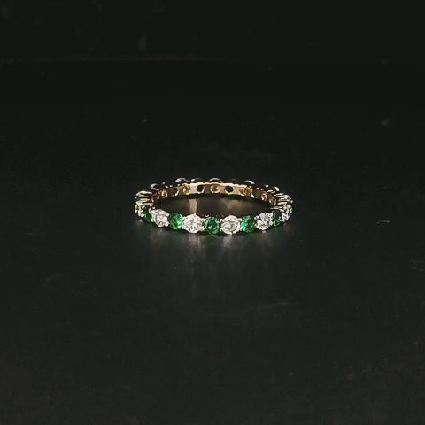 A captivating full-eternity ring crafted in , showcasing a breathtaking pattern of alternating brilliant-cut diamonds and rich green emeralds. The expertly matched stones are channel-set, encircling the finger in a vibrant display of sparkle and deep color. This striking band is a celebration of enduring sophistication and chromatic luxury, perfect for wear on its own or as a luxurious stackable piece.