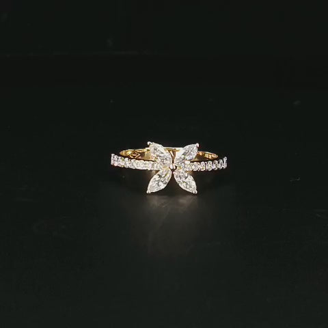 An enchanting open-style ring meticulously crafted in . The focal point is a sparkling clove, composed of four exquisite marquise-cut diamonds, offering a stunning sense of movement and light. The delicate split band is adorned with pavé-set diamonds, completing this utterly feminine and glamorous design. This ring is a vibrant expression of natural beauty and refined style.