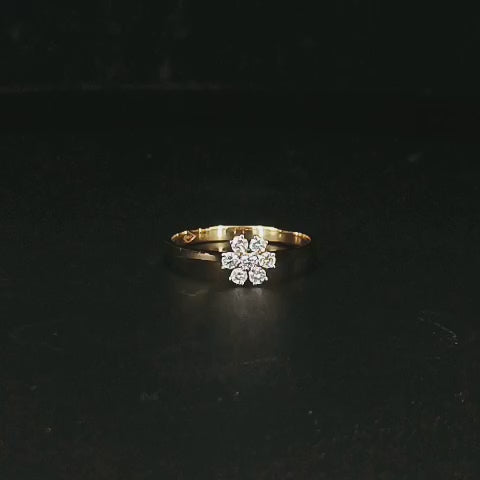 An enchanting and timeless ring featuring a central diamond cluster meticulously arranged to form a blossoming flower silhouette. This elevated floral design is set atop a simple, polished band of , which allows the brilliant sparkle of the diamonds to take center stage. It serves as a delicate and feminine accent piece or a graceful choice for a unique engagement ring alternative.