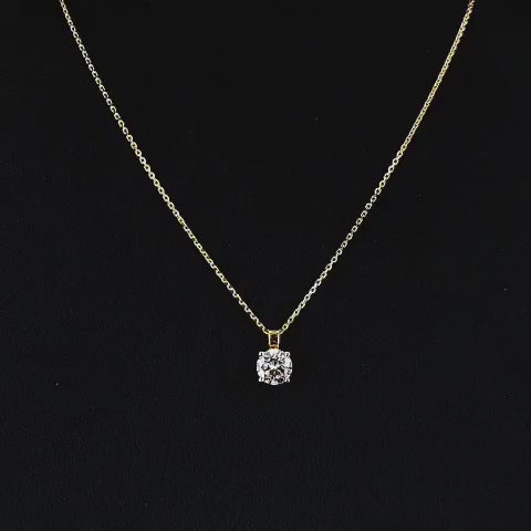 Timeless , the Golden Glow Solitaire Pendant features a brilliant round diamond cradled in a classic four-prong setting. This elegant piece exudes simplicity and sophistication.