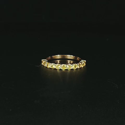 An enchanting half-eternity ring crafted in rich, featuring a continuous line of vibrant, perfectly matched yellow gemstones. The stones are meticulously set to maximize light return, offering a bold yet refined flash of color. This ring is a captivating celebration of joy and brilliance, perfect for stacking or as a radiant standalone wedding band.