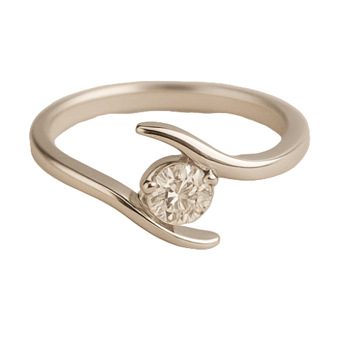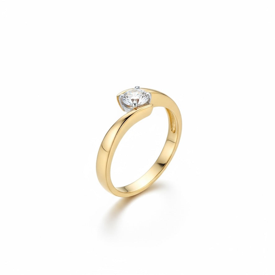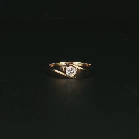 A modern solitaire ring where elegance meets innovation. Crafted in sleek gold, its flowing bypass design gently cradles a brilliant round diamond, symbolizing eternal connection in a graceful embrace.