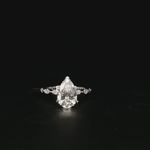 Diamond specifications: 1.05CT center stone and 0.20CT side stones marquise-cut diamonds.