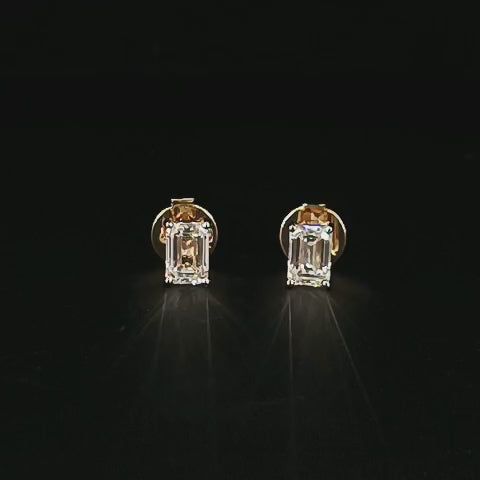 A sophisticated pair of radiant-cut diamond solitaire earrings set in a refined four-prong, yellow gold mounting. The distinguished step-cut faceting showcases the exceptional clarity of the diamonds, creating mesmerizing hall-of-mirrors flash rather than brilliant sparkle.