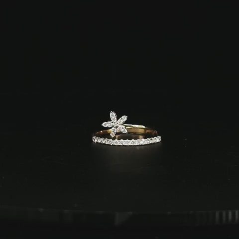 An exquisitely crafted open-wrap ring in, designed to gracefully adorn the finger. One end culminates in a delicate pavé-set diamond flower, mirrored by a shimmering band of channel-set brilliant-cut diamonds. This modern yet poetic piece embodies effortless femininity and is perfect for adding a refined touch of organic luxury to your everyday style.